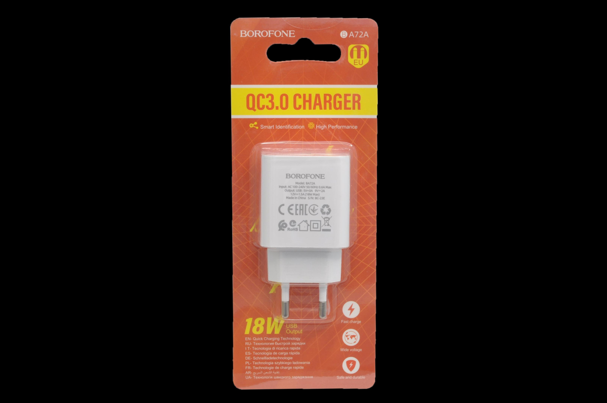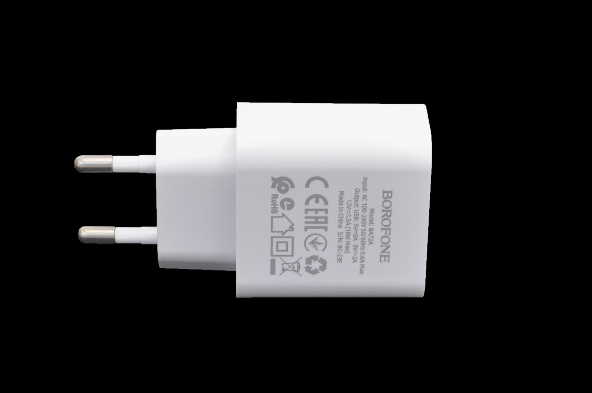 Сетевое зарядное устройство Borofone BA72A, с выходом USB 18W, вилка EU, поддержка протоколов быстрой зарядки
