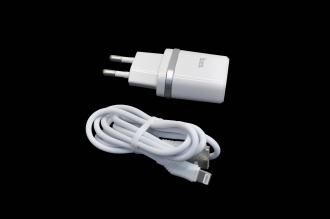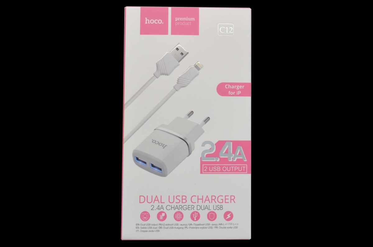Сетевое зарядное устройство HOCO C12. Выход: двойной порт 5 В/2,4 А; европейская вилка, кабель в комплекте USB type A -Apple Ligthing, ПВХ-оплетка, белый