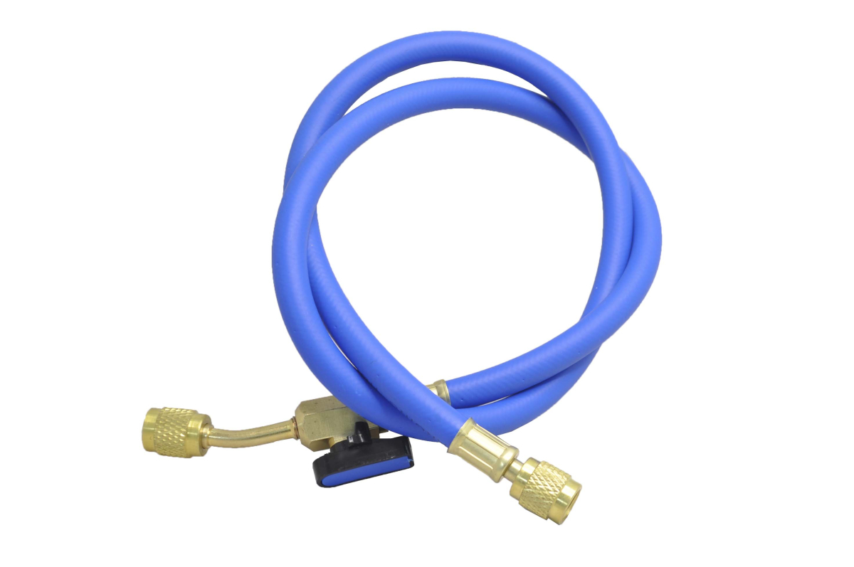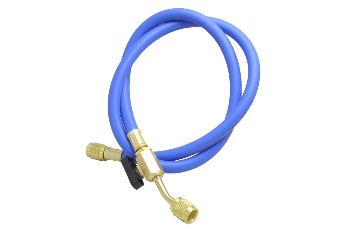 Шланг заправочный 36", длина 90см. Рассчитан на работу с фреонами R-12, R-22, R-502 и давление от 500 до 2500 PSI, с вентилем, металлические фитинги. Цвет варьируется в зависимости от поставки
