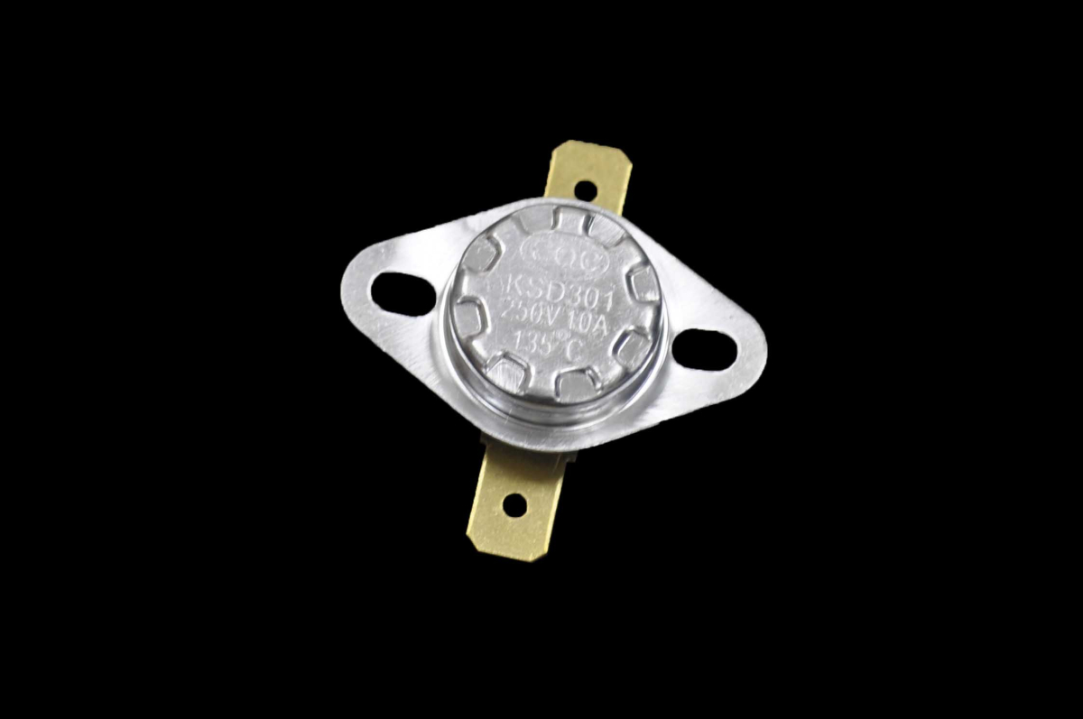 Термостат нормально-замкнутый KSD-301 (биметаллическая пара находится в замкнутом состоянии, при нагреве происходит деформация пластин и размыкание цепи), температура 135 градусов, 10А