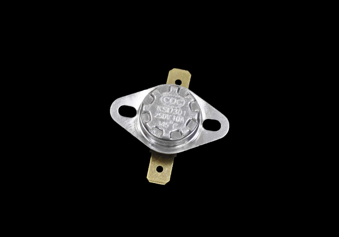 Термостат нормально-замкнутый KSD-301 (биметаллическая пара находится в замкнутом состоянии, при нагреве происходит деформация пластин и размыкание цепи), температура 145 градусов, 10А