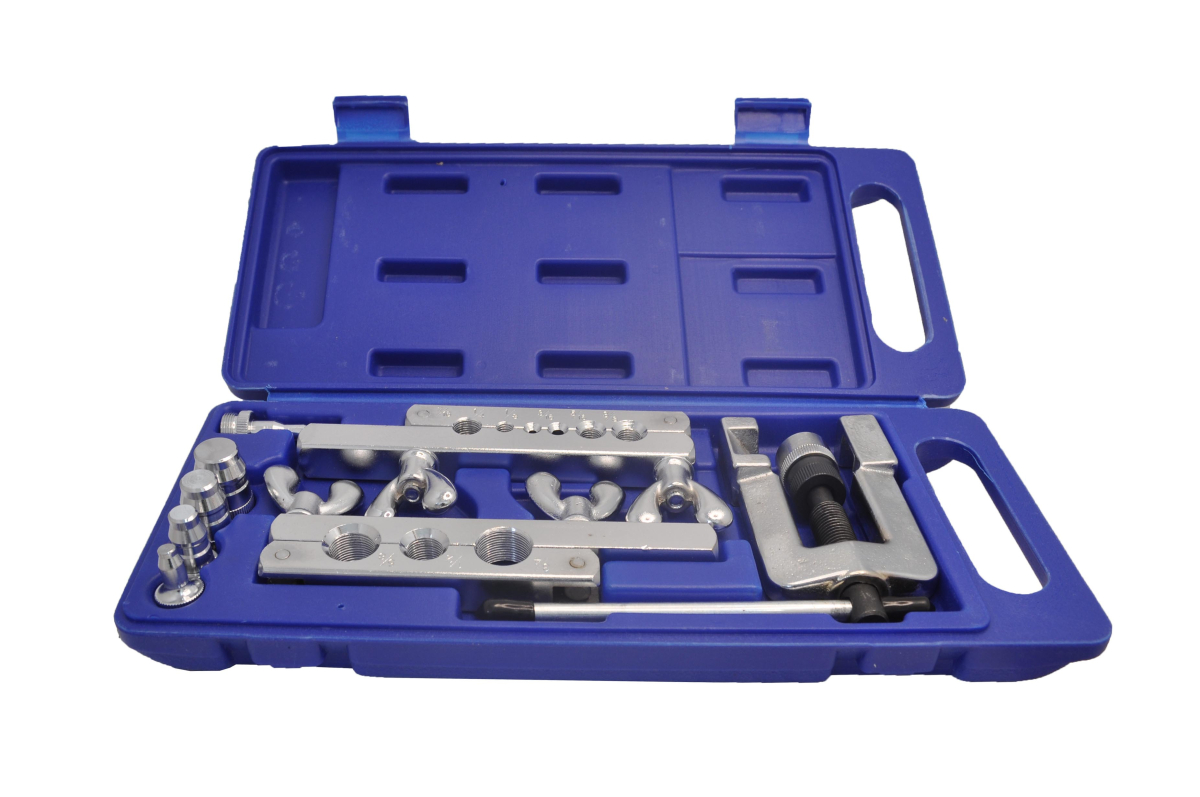 Набор для развальцовки, вальцовки c труборасширителем + кейс для переноски инструмента - 5 насадки для расширения трубы - Плашка с отверстиями: 3/16', 1/4', 5/16', 3/8', 7/16', 1/2', 5/8',3/4' - Пластиковый кейс