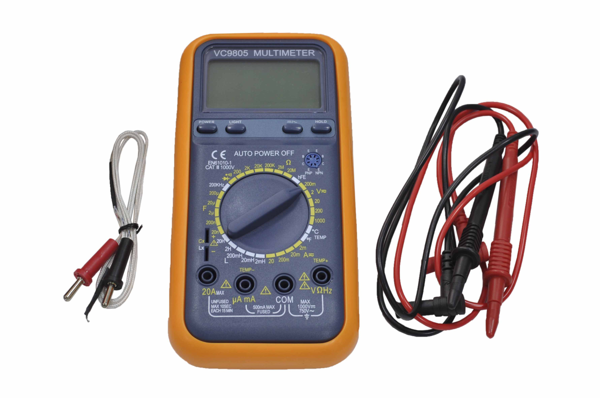 Тестер VC9805 - цифровой мультиметр с питанием от батареи типа крона. Технические характеристики: разрядность ЖК дисплея: 1999 отсчетов(3½), постоянное напряжение: 200 мВ / 2 / 20 / 200 / 1000 В ±(0.5%+3), переменное напряжение: 200 мВ / 2 / 20 / 200 / 700 В ±(0.8%+5), постоянный ток: 2 мА / 20 мА / 200 мА / 20 А ±(0.8%+3), переменный ток: 2 мА / 20 мА / 200 мА / 20 А ±(1.0%+5), сопротивление: 200 Ом / 2 кОм / 20 / 200 кОм / 2 МОм / 20 МОм ±(0.8%+3), емкость конденсаторов: 20 нФ / 200 нФ / 2 мкФ / 20 мкФ / 200 мкФ ±(2.5%+20), индуктивность: 2 мГн / 20 мГн / 200 мГн / 2 Гн / 20 Гн ±(2.5%+3 ед.), частота: 200K ±(1.0%+4), температура: ― 40 … 1000ºC ±(1.0%+4), диодный тест, транзисторный тест: h21, прозвонка соединений, режим HOLD, подсветка дисплея (5 секунд), индикация перегрузки, индикация разряженной батареи. Противоударный холстер. Автовыключение (20 ± 10 минут). Питание: элемент питания 9 В. Габаритные размеры: 185 x 88 x 30 мм (ДхШхТ). Масса: 340г (включая элемент питания).