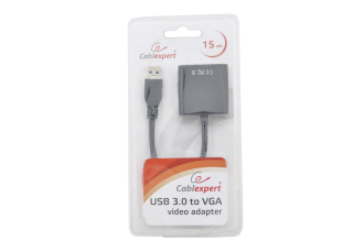 Переходник Cablexpert USB 3.0 – VGA длиной 15 см из разъемов типа «вилка» и «розетка». Аксессуар для передачи высококачественного сигнала цифрового и аудиосигнала с частотой обновления 60 Гц с максимально поддерживаемым разрешением 1920x1080 пикселей.