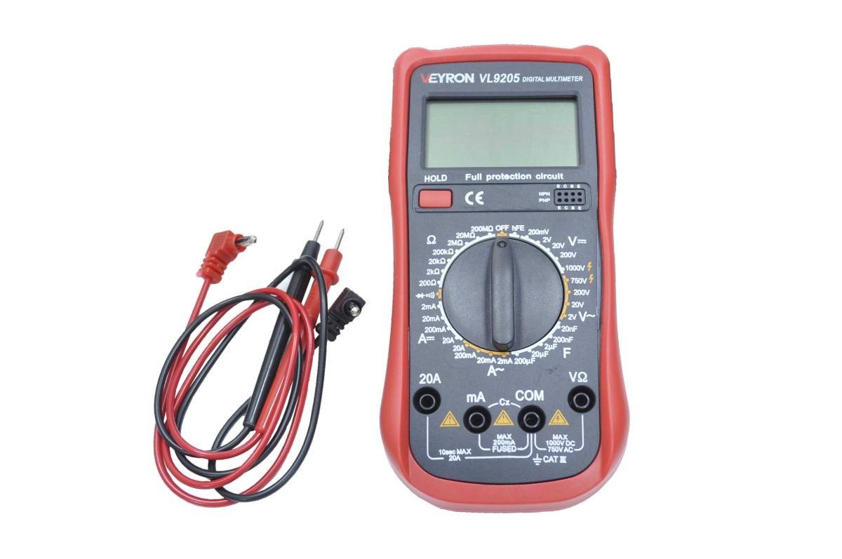 Цифровой мультиметр Veyron Vl9205. Основные характеристики: большой LCD дисплей. Кнопка hold. Защитный мягкий чехол жёлтого цвета. 32-х позиционный переключатель режимов. Индикация выхода за установленный предел измерения. Индикатор разряда батареи. Автоматическая индикация отрицательной полярности. Защита от перегрузки во всех режимах измерения. Режим прозвонки со звуковой и световой индикацией. Функция проверки транзисторов. Провода - щупы в комплекте. Диапазон рабочих температур: 0°C...40°C. Питание: 9 В, батарея 6F22. крона). Размеры: 195х90х35 мм. Вес: 280 г. Электрические параметры: Диапазон измеряемого постоянного напряжения: от 0,1 мВ до 1000 В. Диапазон измеряемого переменного напряжения: от 0,1 мВ до 750 В. Диапазон измеряемого постоянного и переменного тока: от 1 мкА до 10 А. Диапазон измеряемого сопротивления: от 0,1 Ом до 2000 Мом. Диапазон измеряемой ёмкости: от 10 пФ до 200 мкФ. Комплектация:мультиметр,крона, щупы, инструкция