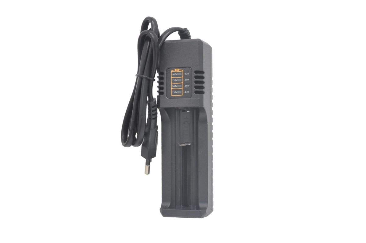 Зарядное устройство для аккумулятора. Напряжение на выходе: 4.2 В. Сила тока на выходе(MAX): 1 A. Типоразмер заряжаемых аккумуляторов: 10440/14500/16340/16650/17355/17500/17670/18350/18500/18650. Количество гнёзд для аккумуляторов: 1. Цвет: черный. Размер: 37*30*110 мм. Материал: пластик. Комплектация: шнур microUSB
