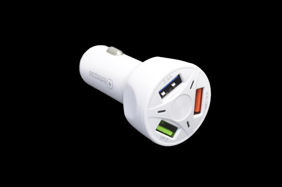 Зарядное устройство для автоприкуривателя. USB: 3. Напряжение на выходе: QC3.0 (5-12 В). Сила тока на выходе(MAX): 7 А. Цвет: белый. Размер: 70*36 мм. Материал: пластик